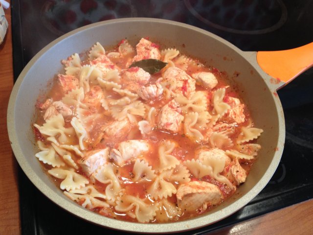 - Отвариваем пасту. В большой кастрюле доводим воду до кипения‚ добавляем соль и отвариваем фарфалле до состояния "аль денте" (слегка недоваренные). Откидываем пасту на дуршлаг‚ сохраняя немного воды‚ в которой она варилась.
