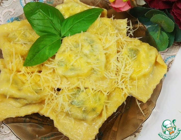 - Полейте равиоли растопленным сливочным маслом‚ посыпьте тертым пармезаном и свежей зеленью.
