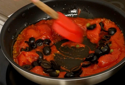 - Добавьте оливки и каперсы и обжарьте их в течение нескольких минут.